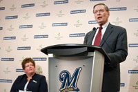 From left, Milwaukee Brewers Chairman and Principal Owner Mark Attanasio, UW-Madison Chancellor Biddy Martin and Major League Baseball Commissioner Allan H. 'Bud' Selig